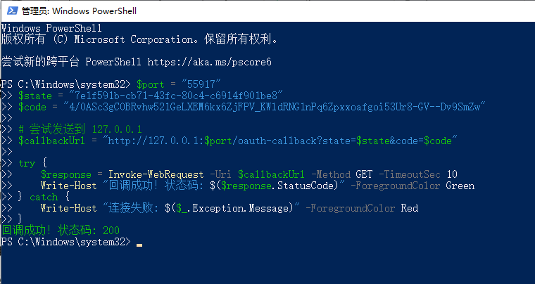 Write-Host "回调成功!状态码: $($response.StatusCode)" -ForegroundColor Green